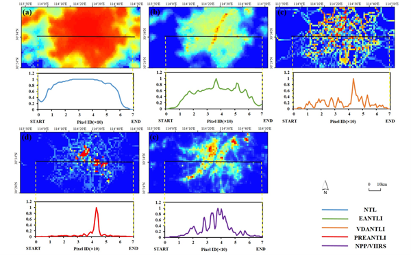Fig. 1. Transect passing through the potentially saturated areas of Wuhan: (a) NTL, (b) EANTLI, (c) VDANTLI, (d) PREANTLI, (e) NPP/VIIRS.