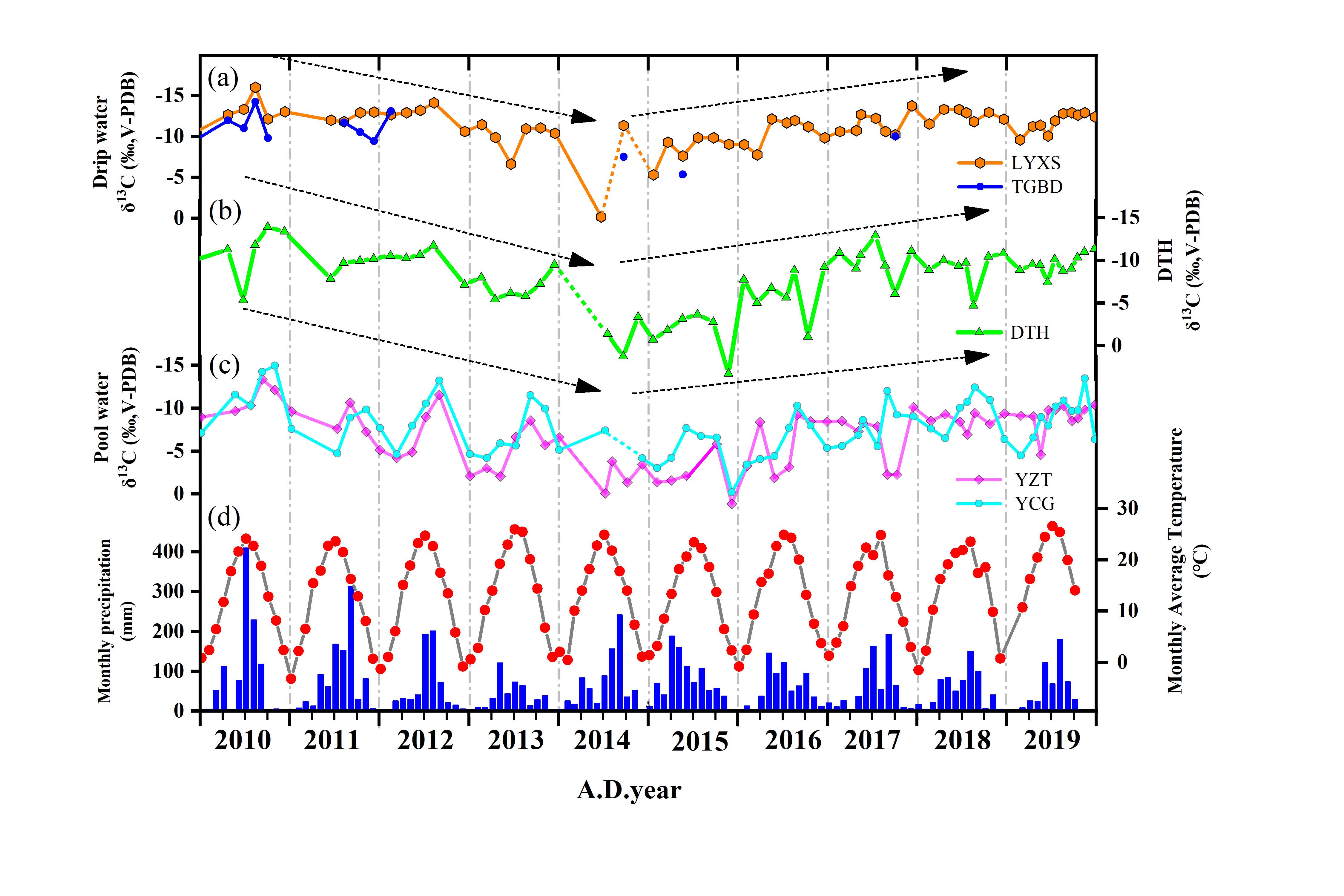 2020年12月11日,国际著名水文学期刊Journal of Hydrology (TOP期刊)在线发表了yl23411、岩溶环境重庆市重点实验室杨琰教授所带领的研究小组的最新科研成果。洞穴监测可以厘清碳同位素信号在岩溶关键带中的传输过程,对揭示岩溶系统碳同位素的影响因素及其运移机制有重要意义。但是碳同位素影响因素复杂,需要通过多年监测以及近百年高分辨石笋记录来揭示不同尺度气候变化对δ13C记录的影响。