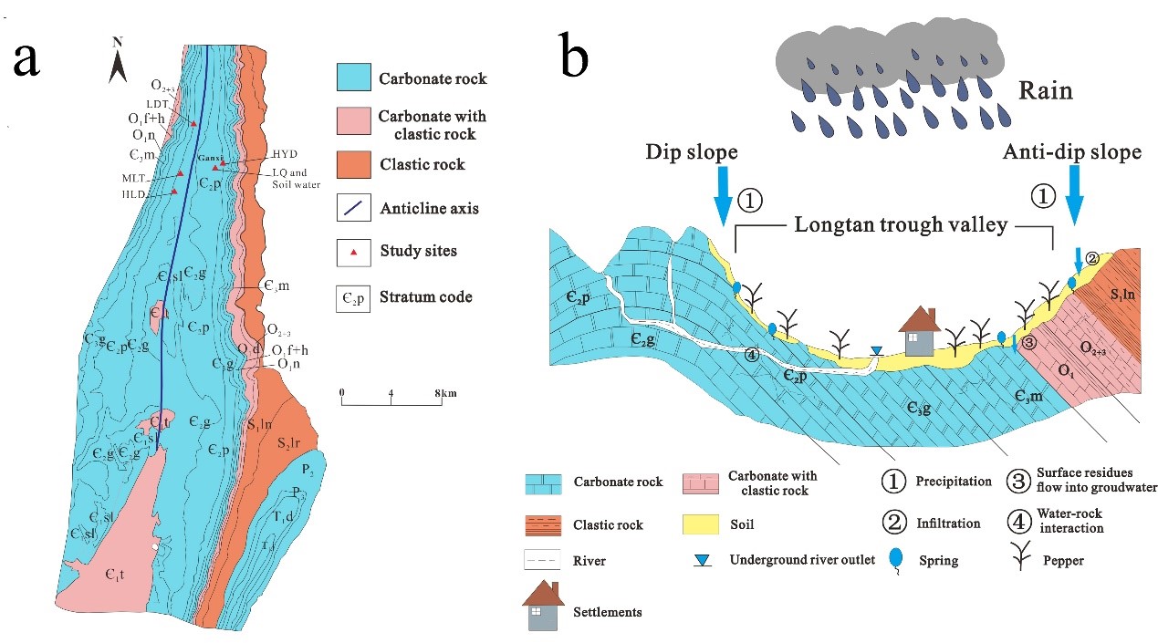 在国家重点研发计划专题项目:酉阳龙潭槽谷区水资源动态变化及环境效应研究(批准号:2016YFC050230205)和国家自然科学基金项目(41975114)等的支持下,从2017年至今,杨琰教授课题组对国家石漠化综合治理重点县重庆市酉阳进行了连续4年的监测。前人研究发现岩层倾角、倾向关系等都会导致顺/逆坡的植被覆盖程度不同;由于顺坡水土流失比逆坡严重,造成顺坡地区大面积裸露基岩发育,侵蚀影响显著。同时,岩层倾角对地表水力特征有重要影响,导致岩溶槽谷水土流失空间分布的差异。在本研究区重庆酉阳龙潭槽谷的顺/逆坡土壤覆盖、植被覆盖差异明显(图1, 图2)。因此,在相同的气候条件下,利用碳同位素研究喀斯特石漠化槽谷区植被恢复差异造成的水文生态机制及环境效应具有重要的理论及现实意义。本成果以重庆市酉阳县龙潭槽谷泔溪镇的石漠化重点治理区为研究点(图1, 图2),从2017年1月至2019年12月,监测顺/逆坡的表生泉、坡面流和土壤水中pH值、电导率、δ13CDIC、阴阳离子浓度、δ18O及δD等环境指标。另外,在强降雨条件下,对顺/逆坡不同植被覆盖区域地下水和坡面流的碳同位素等指标变化进行了详细的研究。
