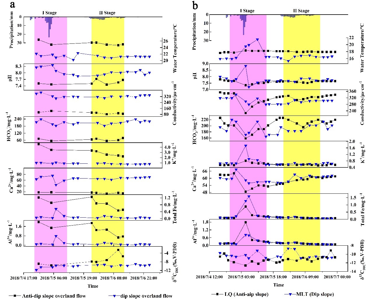 图3 (a) 2018年7月4日-7月7日强降雨过程中喀斯特槽谷坡面流δ13CDIC和水化学元素的变化特征; (b) 2018年7月4日-7月7日强降雨过程中喀斯特槽谷顺/逆坡地下水δ13CDIC和水化学元素的变化特征