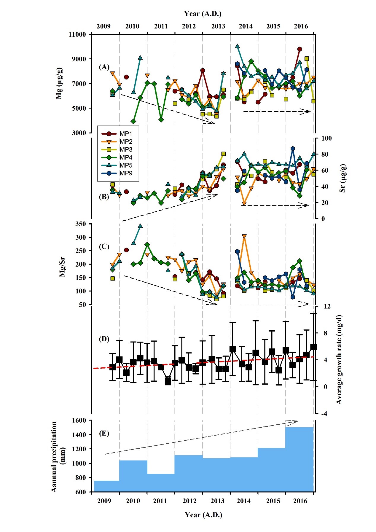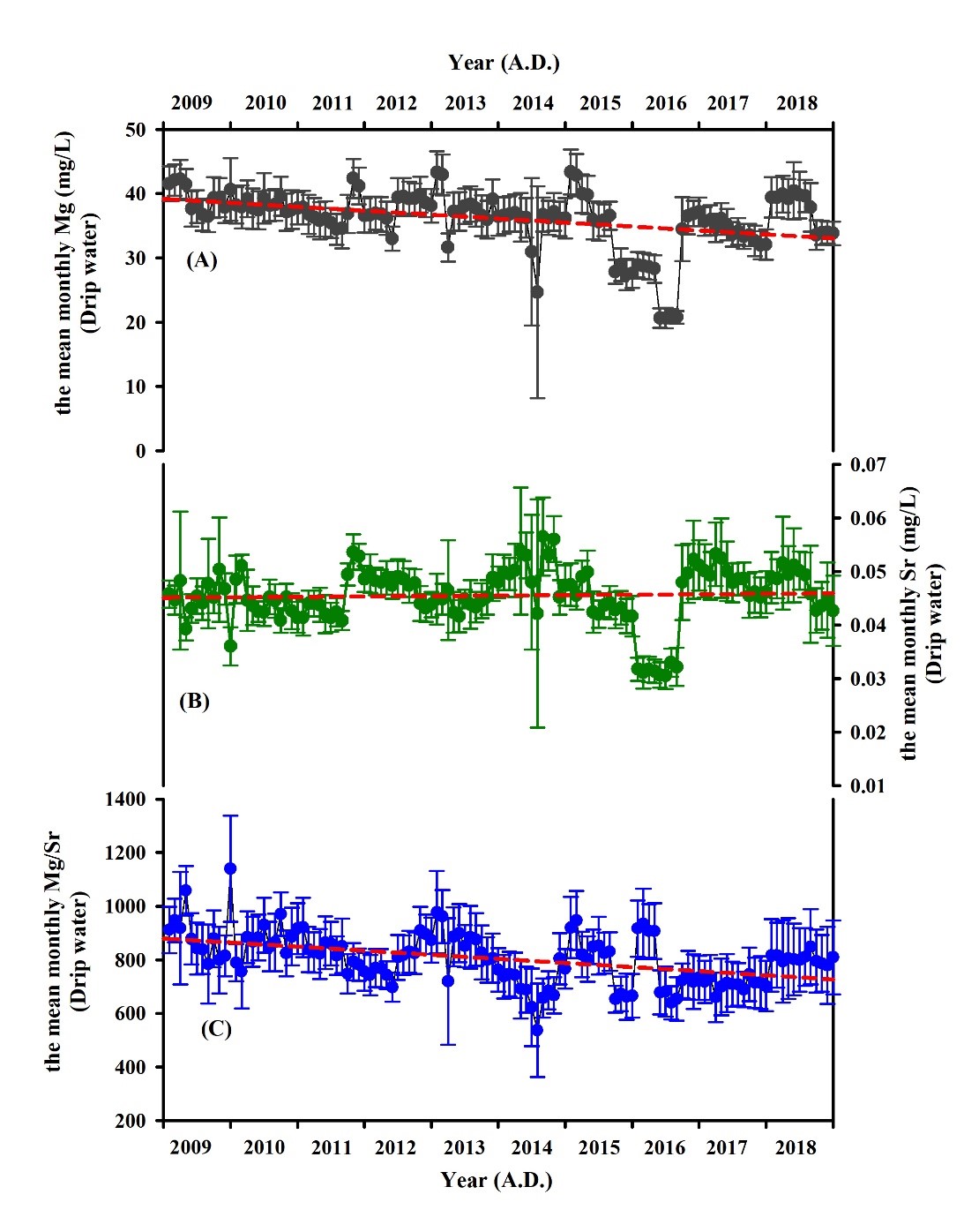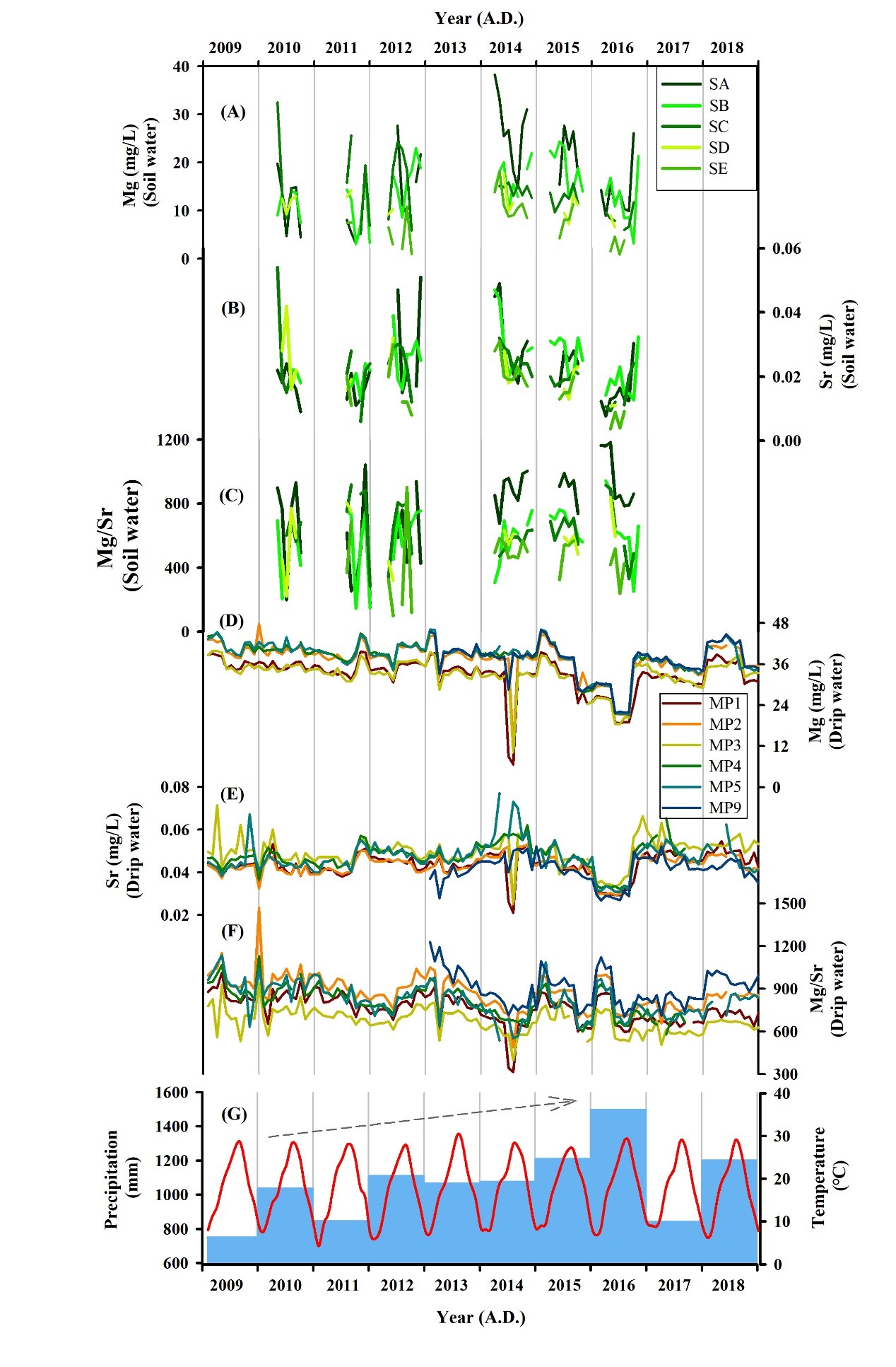 李俊云副教授和李廷勇教授团队自2005年起,在重庆芙蓉洞建立了洞穴监测系统,已经发表了多篇研究论文。在本研究中,利用2009-2018年期间对地表土壤、土壤水、基岩、洞穴滴水、洞穴新生碳酸盐沉积物等的监测,详细进行了Mg、Sr、Mg/Sr比值以及87Sr/86Sr比值的分析,并与监测期间的区域月降水量和年降水量进行了对比。