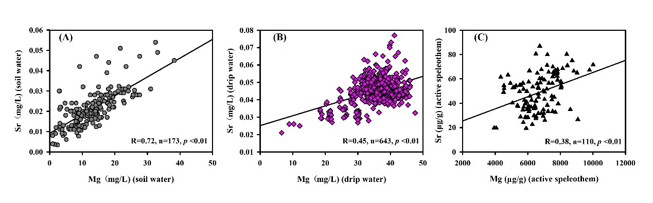 图3 土壤水,滴水和新生沉积物中Mg和 Sr的相关性分析