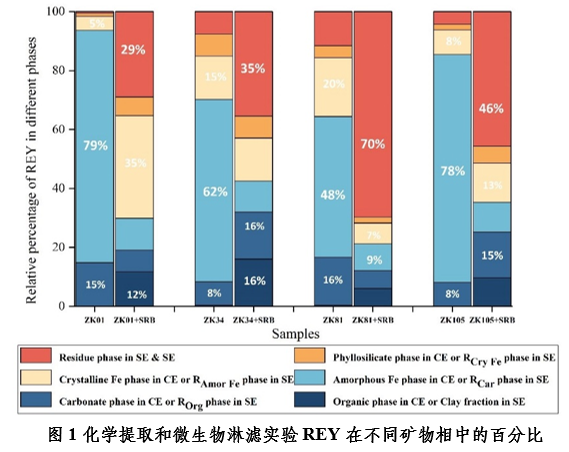 研究选取江西赣南韩坊稀土矿床的风化壳样品,结合硫酸盐还原菌(SRB)构建粘粒-SRB体系,利用XRD、Raman、ATR-FTIR、SEM、EDS等表征手段对化学提取和微生物提取实验后的REY赋存形态和分馏模式进行了探讨。研究发现SRB会改变REY在不同矿物相的赋存特征。在连续化学提取实验中,REY主要赋存在不定型铁相、晶体铁相和盐酸盐相中。铁相矿物由于较大的比表面积和表面羟基作用可以吸附/络合大量稀土元素;碳酸盐中的REY则主要被CO32-或HCO3-络合。微生物淋滤实验中,残渣相、RAmor Fe相(去除有机质、碳酸盐、不定型铁相的残余相)和ROrg相(去除有机质的残余相)是REY的主要赋存相。残渣态伊利石中Fe和有机物质之间的耦合作用是反应早期阶段促进SRB活性的重要因素;铁矿物中Fe(Ⅲ)和Fe(Ⅱ)之间的转化作用可能会导致次生含铁矿物的形成及含铁矿物结构的改变,促进氧化还原反应的进行并造成REY的溶解差异。