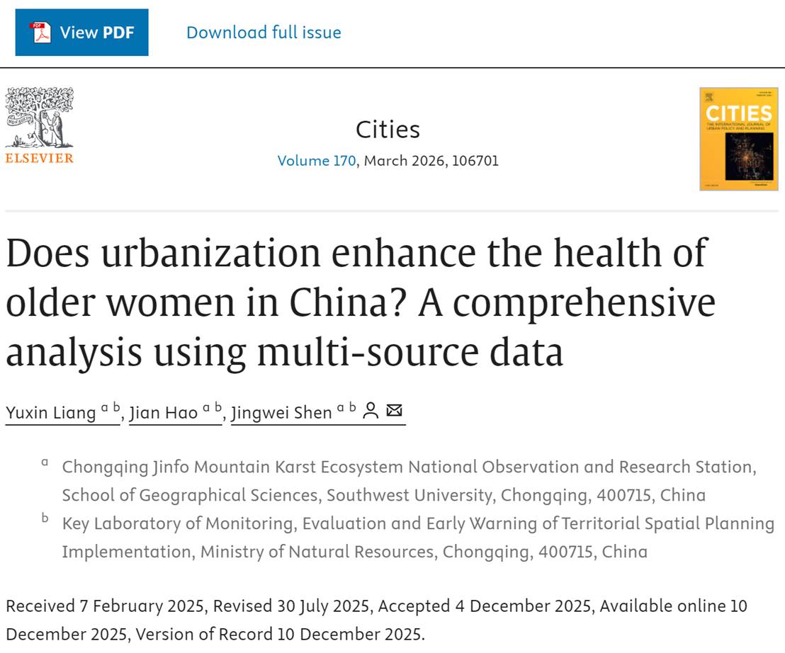 近日,沈敬伟副教授课题组在Cities期刊上发表了题为“Does urbanization enhance the health of older women in China? A comprehensive analysis using multi-source data”的最新研究成果。