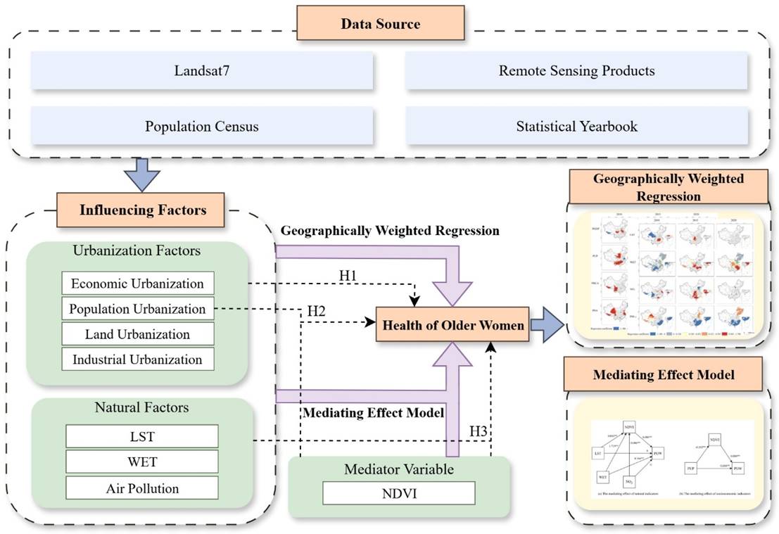基于2010年、2015年和2020年中国人口普查数据,本研究探讨了城市化背景下老年女性健康的时空格局以及社会经济因素和自然因素对老年女性健康的影响机制。利用GWR分析了不同城市特征下健康影响的空间异质性,并进一步通过中介效应模型揭示NDVI在其中的中介作用(图2)。此外,为了增强政策的针对性,本研究还对不同性别和不同空气污染水平对健康影响的差异进行了分组回归分析。本研究有望为制定更有针对性的健康干预策略提供科学依据,为推进“健康中国”战略提供有力支持。