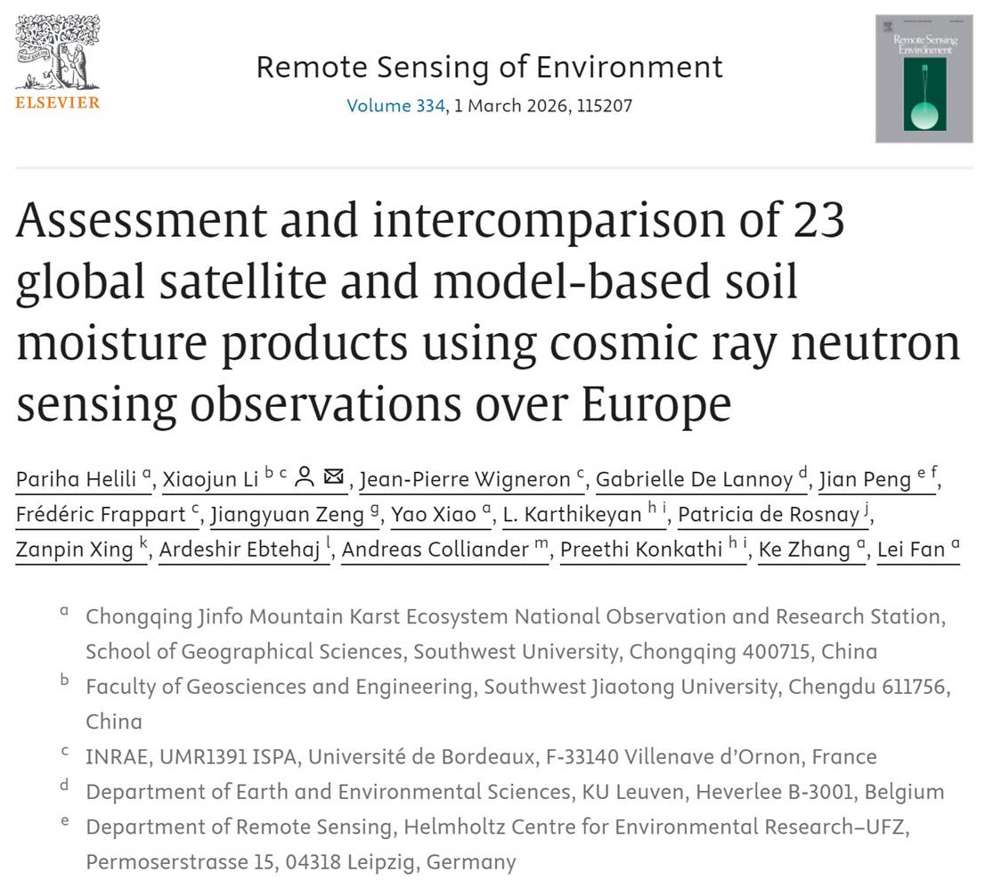 近日,樊磊教授团队在国际遥感领域TOP期刊Remote Sensing of Environment(IF=11.4)上发表了题为“Assessment and intercomparison of 23 global satellite and model-based soil moisture products using cosmic ray neutron sensing observations over Europe”的最新研究成果。系统评估不同来源土壤水分产品的性能差异,对于推动全球土壤水分产品算法的持续改进和促进其在水文、气候与生态等领域的应用具有重要意义。