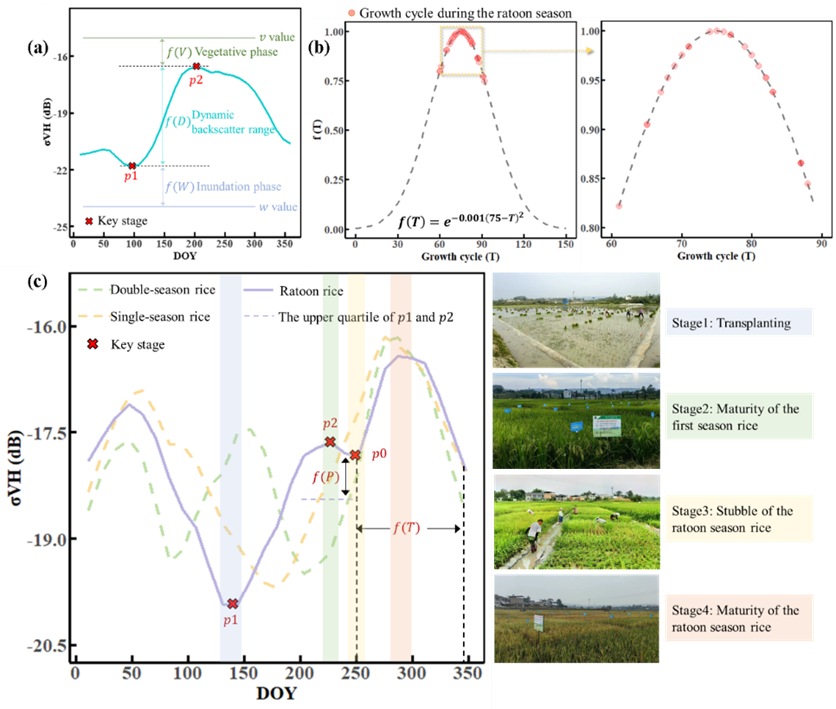 (b) 函数 f(T) 的示意图及再生季生育期样本;(c) SRRI 的特征示意图、不同水稻类型的Sentinel-1 VH极化时间序列曲线,以及再生稻主要物候期的影像示意图