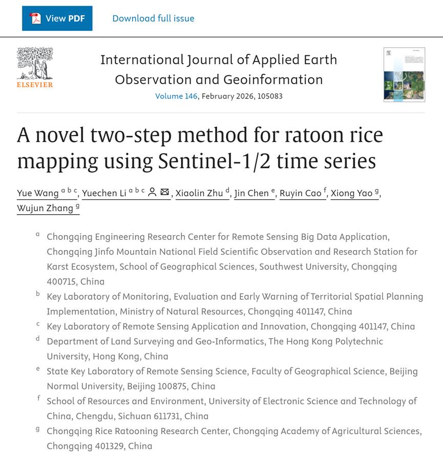 近日,李月臣教授团队联合香港理工大学朱孝林教授团队、北京师范大学陈晋教授团队、电子科技大学曹入尹教授团队、重庆市农业科公司水稻研究所(重庆再生稻研究中心)姚雄研究员团队在International Journal of Applied Earth Observation and Geoinformation(中科院SCI一区,地球科学TOP,IF =8.6)上发表了题为“A novel two-step method for ratoon rice mapping using Sentinel-1/2 time series”的研究论文。该研究提出一种基于地块尺度多源遥感数据的两步法再生稻(TSRR)制图方法。