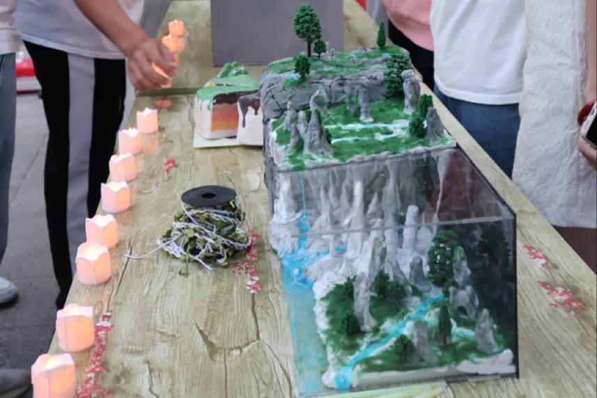 本次活动包括科普展览、天文观测、趣味游戏等内容。科普展览以“走进自然,环保低碳”为主线,讲述了碳的“前世今生”。活动现场,同学们被各类形状各异的岩石标本、制作精巧的地理模具吸引,纷纷驻足观看。一块块奇特的岩石、一件件制作精巧的地理模具纷纷映入眼帘,有恍若幽蓝月光的“月亮石”,有颜色酷似孔雀羽毛的“孔雀石”等。由地科院员工亲手制作的地理模具,还展示了在漫长地质历史中和特定地质条件下,碳酸盐岩地区洞穴内形成的石钟乳、石笋、石柱等。
