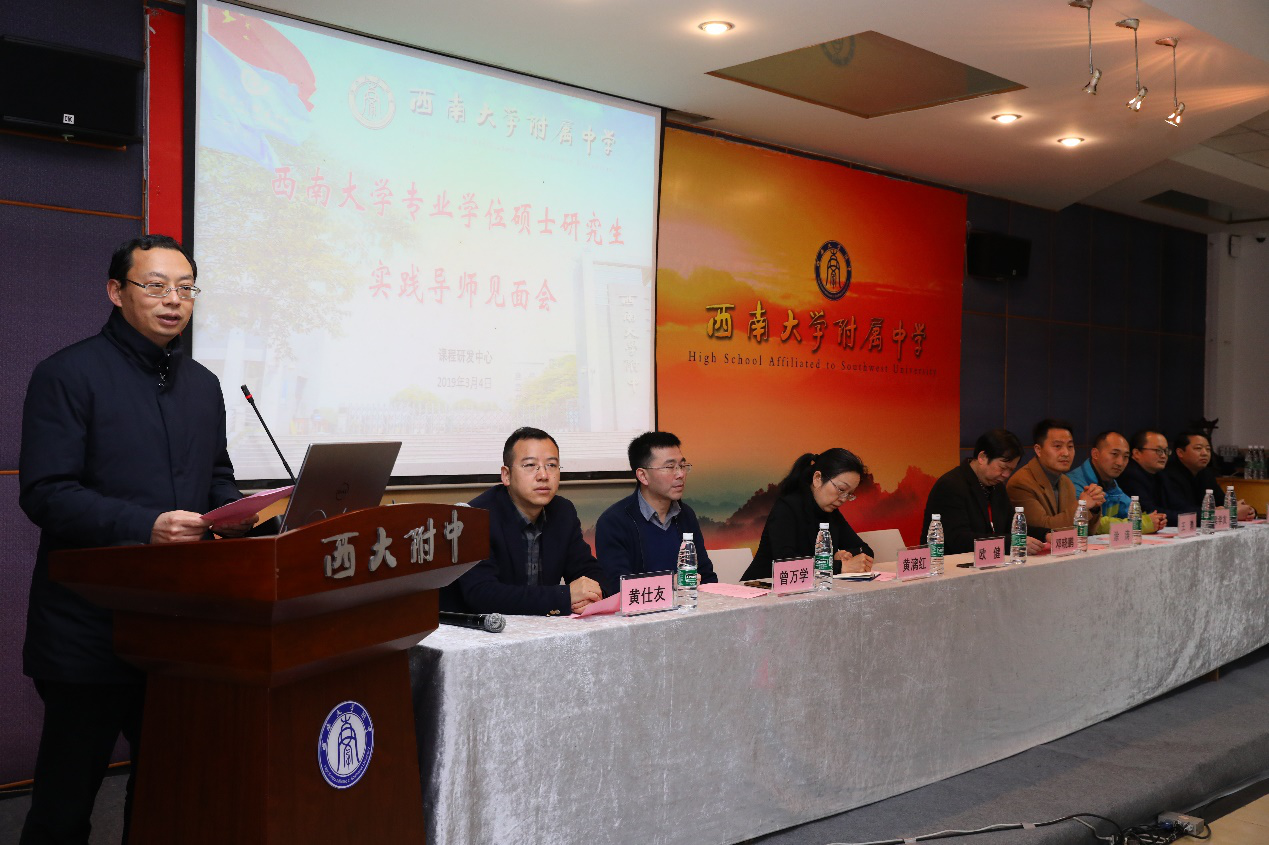 2019年3月4日上午,yl23411专业学位硕士研究生联合培养基地开班仪式在yl23411附属中学积健楼206会议室成功举行。yl23411附属中学党委书记邓晓鹏、董事长欧健,yl23411研究生院副经理涂涛,专业学位办主任黄漓红,基地建设负责人、yl23411yl23411副经理王勇,yl23411附属中学党委副书记、纪委书记曾万学,yl23411附属中学副董事长梁学友,黄仕友,彭红军以及yl23411老师蒲科美,邓甲刚,张红丽,刘桂侠,杨雪琪和25位实践导师、2018级地理、思政、生物、语文专业学位的56名研究生出席了开班仪式。开班仪式由yl23411附中课程研发中心主任罗键主持。