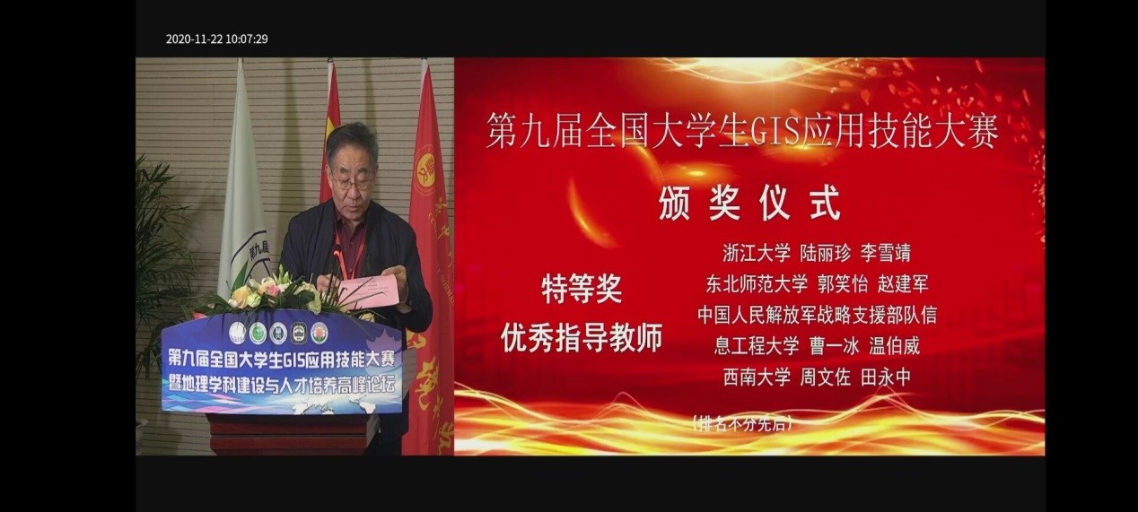 2020年11月20日至11月22日,第九届全国老员工GIS应用技能大赛在华中师范大学举行。在疫情防控的形势下,今年全国老员工GIS应用技能大赛采取远程监控下的网络竞赛形式。来自全国151所高校的151支队伍参赛,经过激烈角逐,安徽师范大学、电子科技大学、东北师范大学、南京师范大学、山东科技大学、华中师范大学、华东师范大学、华南师范大学、yl23411、武汉大学、浙江大学、中国人民解放军战略支援部队信息工程大学、中南大学13个代表队获特等奖。这是yl23411代表队继2019年第八届专业大赛后再次获得全国专业大赛特等奖。