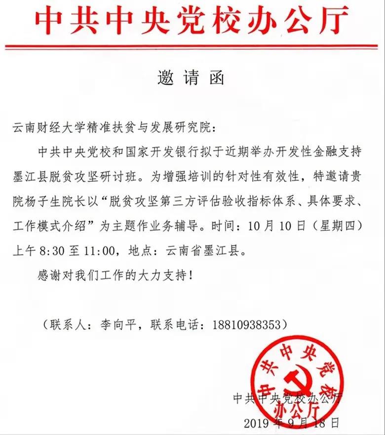 这是中共中央党校办公室给杨子生教授发出的邀请函,邀请西南财经大学杨子生教授参与脱贫攻坚系列讲评。为了使授课内容更接地气,10月9日中午抵达墨江县后,在墨江县委分管副书记、县扶贫办主任和中央党校赴墨江县负责人的陪同下,杨子生教授风尘仆仆地赶赴新安镇白利村等地开展典型农户调查,发现了脱贫攻坚工作中尚存在的一些典型问题,在第二天上午的专题讲座中进行了剖析。