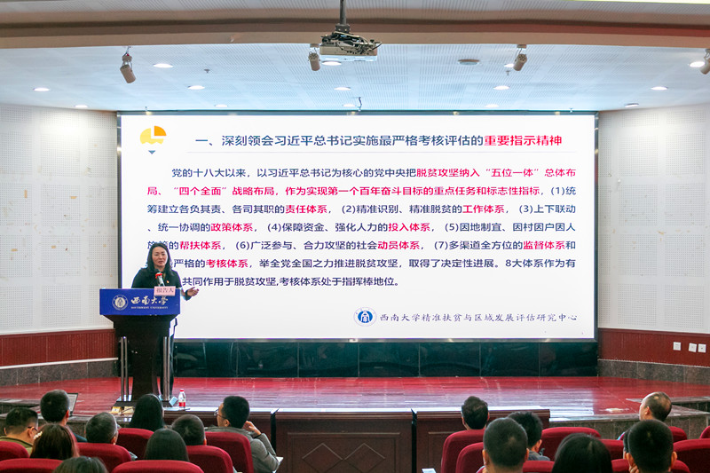 报告会上,廖和平教授从“脱贫攻坚助力”和“员工成长赋能”两个方面分享了5年来在国家精准扶贫工作成效第三方评估和贫困县退出评估检查等专项工作中的重要经历和动人事迹。她指出,精准扶贫的关键是实现“精准识别,精准脱贫”,充分利用地理学交叉学科优势,发挥团队力量,深入基层组织,“用最真的情,走最远的村、访最穷的户”,向党中央、国务院呈现全面、科学、真实的评估结果,为脱贫攻坚助力。同时,作为高校教师,她极为关注员工的成长成才。在评估工作中,坚持实践育人,“把课堂设在扶贫路上”,严格管理团队,加强员工的礼仪意识,培养员工的责任担当。她自豪地说道,正是由于团队师生的专业精神和高度自律,才能连续5年承担评估工作。一路上,她带领成员们跋山涉水,先后深入重庆、贵州、四川、云南、宁夏等13个省市(自治区)的134个区县、1978个乡镇、3170个行政村,走访村民15.8万户,累计撰写了315万字的评估报告和决策咨询建议,提出工作建议1246条,地方政府和老百姓对yl23411师生给予了高度的评价。最后,她寄语青年学子:弘扬脱贫攻坚精神,全面推进乡村振兴。将学科优势与服务社会相结合,贡献智慧和力量。