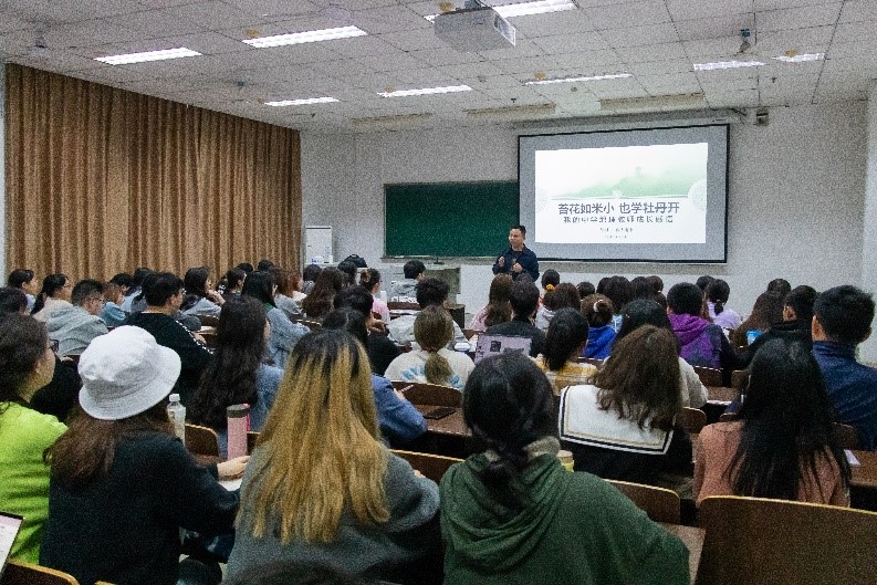 在介绍分享会主题由来时,缪羽老师言:“‘苔花如米小,也学牡丹开’,这是著名作家刘心武在《百家讲坛》栏目中谈红学时讲到的,既表示了他与曹雪芹大师同为作家,一样有自己的见解,也表示了他的谦恭之意。即使如同苔花一般平凡渺小,也要在自己的岗位上发光发热,贡献力量。而我作为一名中学教师,虽然普通平凡,但我会对教育事业满怀热情,贡献出我的力量!”