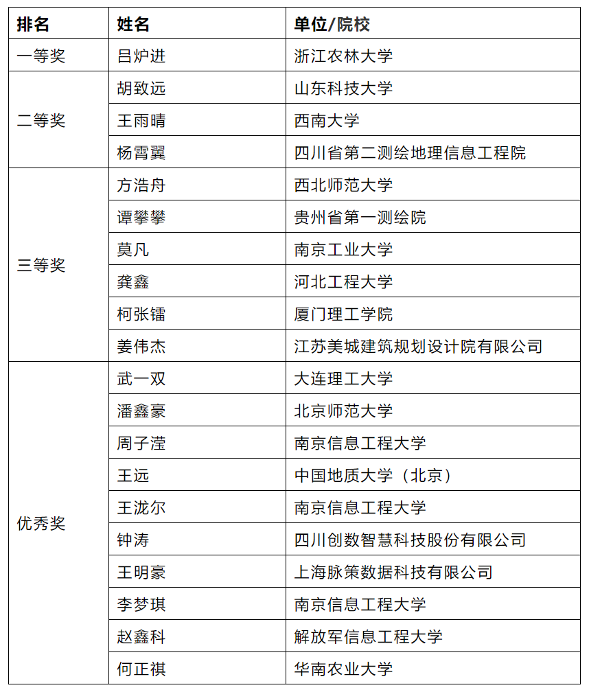 由中国信息协会与易智瑞信息技术有限公司、中科地信(北京)遥感信息技术联合举办的“2021年地理信息技术与应用技能大赛”决赛于2021年10月16日成功举行。yl23411的王雨晴同学最终综合排名第3,荣获二等奖,田永中老师荣获优秀指导老师。