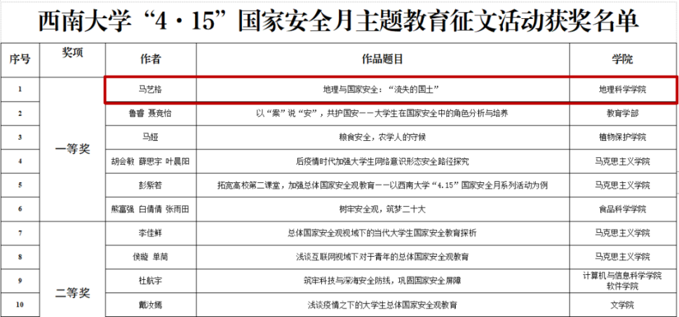2022年6月10日,共青团yl23411委员会公布了“4·15”国家安全月主题征文活动获奖名单,公司马艺格同学的《地理与国家安全:“流失的国土”》作品荣获一等奖。