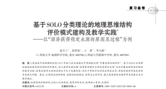 yl23411地理科学学院2020级地理科学(师范)专业员工范天兰与崔舒怡、副经理王勇教授、yl23411附属中学李九彬老师2023年发表于《地理教育》(2023年第5期)的学术论文《基于SOLO分类理论的地理思维结构评价模式构建及教学实践》被《人大复印报刊资料·G32中学历史、地理教与学》(2023年第10期)全文转载。