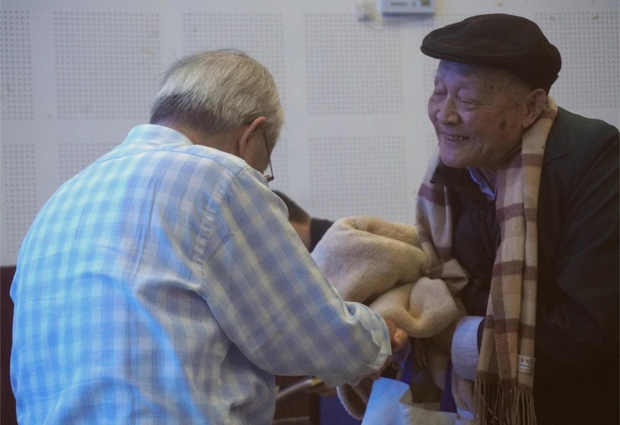 (梁鹤年教授与袁道先院士握手交流)