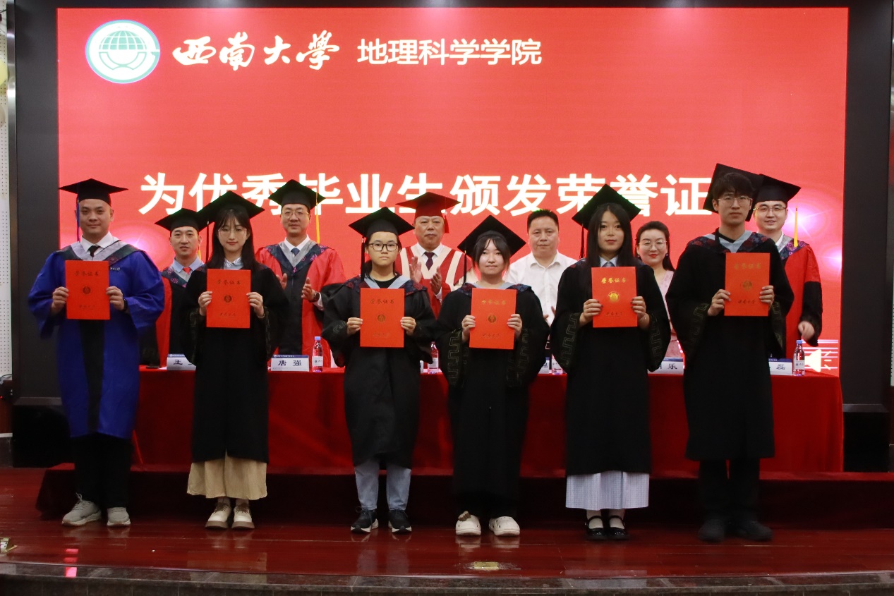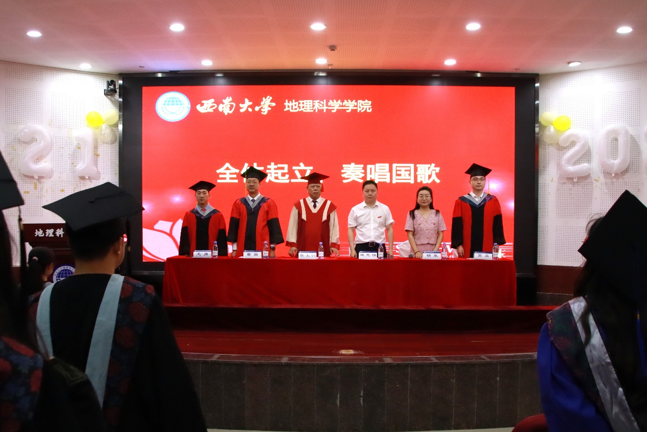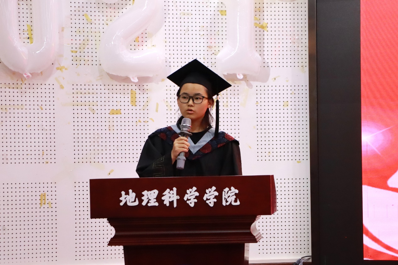 教师代表王亚辉教授以自身从农村学子“逆袭”成教授的经历激励毕业生。结合当下时代新背景,王老师提出“坚忍毅力、终身学习、乐观心态、为人大气、感恩之心”五个关键词。他寄语同学们秉持敏锐与执着,用地理智慧丈量世界,在人生新域积极探索,顺势而上绽放个人光芒。