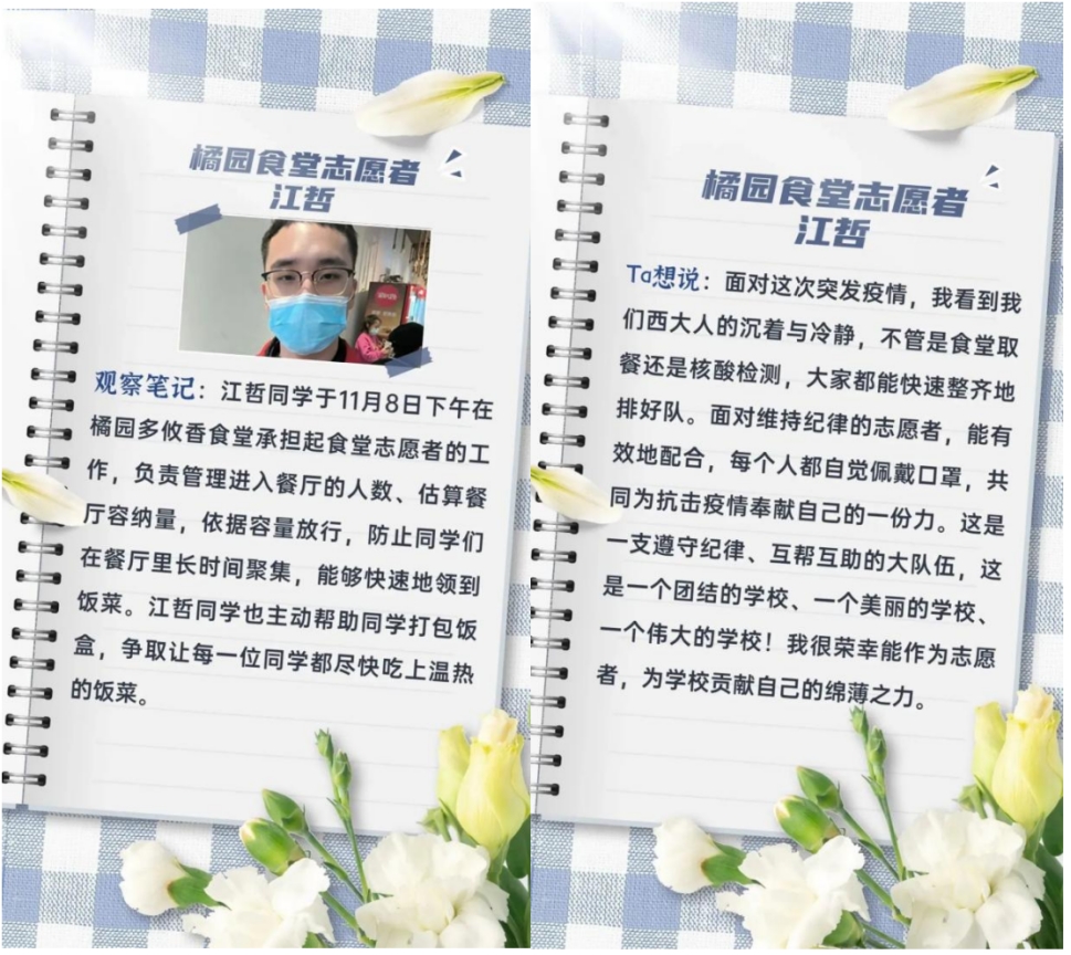 疫情防控重于泰山,平静的生活下是无数志愿者奔波的身影。在我们身边,总有那么一群人,他们毅然决然地奉献自己,为同学们尽心尽力,勇于担当,做疫情中的“逆行者”,冲锋在为人民服务的前线。
