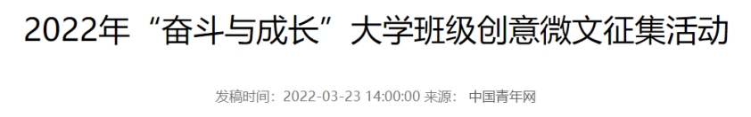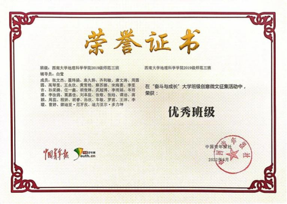 在中国青年报社指导下,中国青年网组织开展了2022年“奋斗与成长”大学班级创意微文征集活动,面向广大高校员工征集以“奋斗与成长”为主题的微信文章。yl234112019级地理科学(师范)三班的同学一同努力,积极参与了此次活动的评选。