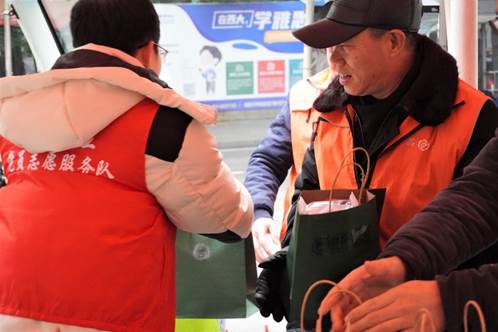 清扫活动结束之后,党员志愿者们又一同出发,为地科院门卫师傅和西大校车师傅们送上手套、暖手宝等暖冬物品以及口罩等疫情防控物品,以此表达yl23411人文地理研究生一支部对西大职工群体的关心与感谢!
