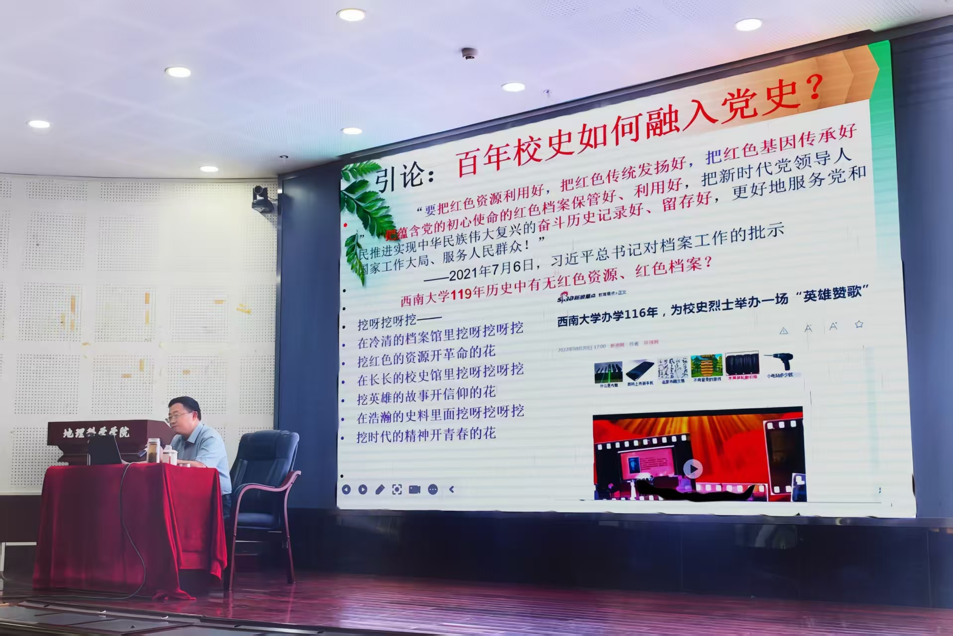 集团档案馆、校史馆、博物馆副馆长郑劲松以“红色基因,青春西大——党史在西大”为主题展开培训,巧妙地将校史与党史相结合,讲述yl23411党员员工积极投身祖国建设的动人故事,激励青年学子担当时代责任,为民族复兴伟业贡献青春力量。