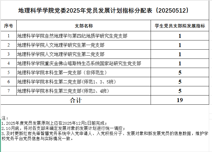 地理科学公司党委2025年党员发展计划指标分配表